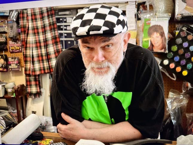 I can’t believe that it hadn’t occurred to me how hard the first Halloween season without Paul would be. If Halloween is the gay Christmas, its equivalent to Santa Claus would be Paul Pearson. I don’t mean “equivalent” like the fantasy holiday world of The Nightmare Before Christmas; he was not a spooky-ooky-spoopy-creepy Jack Skellington type (although he loved that stuff). I mean a playful, larger-than-life man with a wicked grin, the biggest full-body laugh you ever heard, and who deeply understood the possibility, power, and wonder of playing dress up. Whether you wanted to celebrate the night as a monster, a showgirl, a super esoteric reference hardly anyone at the party would understand, or a concept that relied entirely on a groan-worthy pun, Paul made your make-believe dreams come true. He was the face who greeted customers at Fringe and Tassel Costumes for 20 years.